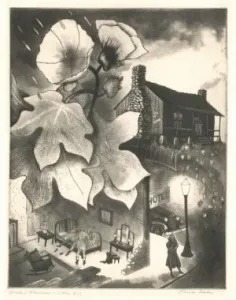 Baker, a white male, frequently focused his work on the social issues of racial injustice and violence during the 1940s. Leading graphic arts historian and curator Carl Zigrosser described him as “one of the first native artists to reckon with the problems of the new South.” His later work often investigated issues of mortality.